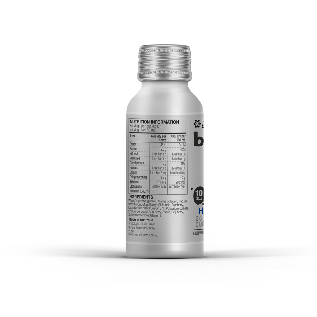 Henry Blooms BellyMe Hair Nail Skin Collagen + Se 60ml is a premium hair nail skin collagen supplement designed to boost hair and nails while enhancing skin health. This collagen with selenium formula delivers a powerful beauty collagen boost by combining marine collagen supplement with antioxidant rich berries and probiotics to nourish your body from within. Each 60ml serving contains 10 billion cells of Lactobacillus plantarum (L-137), a probiotic collagen drink ingredient that supports nutrient absorption and promotes digestive health, making it an effective nutrient absorption aid. Shake well and enjoy your daily dose of this skin hair nail vitamins blend for revitalized, glowing skin and stronger hair and nails.