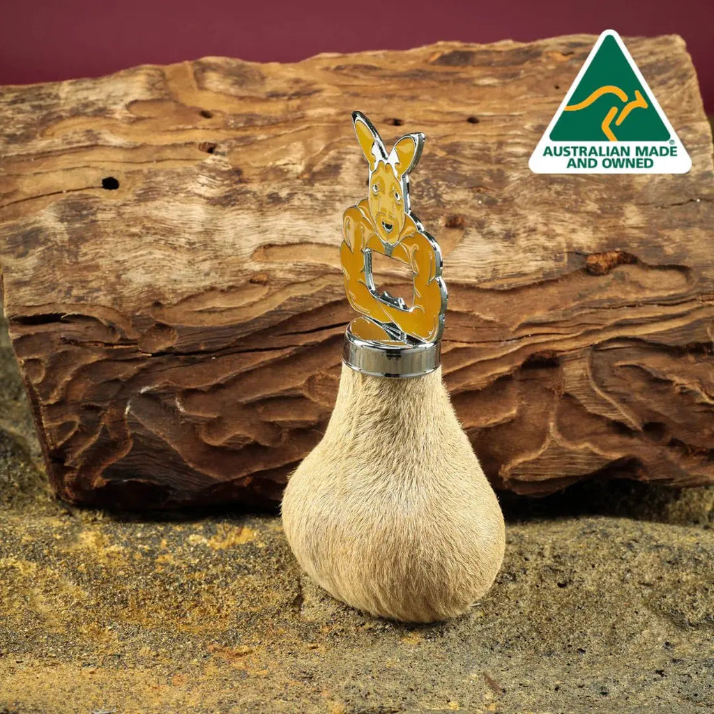 The kangaroo scrotum bottle opener is a unique bottle opener crafted from genuine kangaroo scrotum, designed to offer a distinctive and functional way to open your drinks. This Australian made opener features a muscle kangaroo design on top, making it an eye-catching novelty drink accessory and an ideal Australian wildlife gift. Measuring large for comfortable grip and ease of use, this handcrafted bottle opener combines natural materials with practical use to deliver both style and utility.