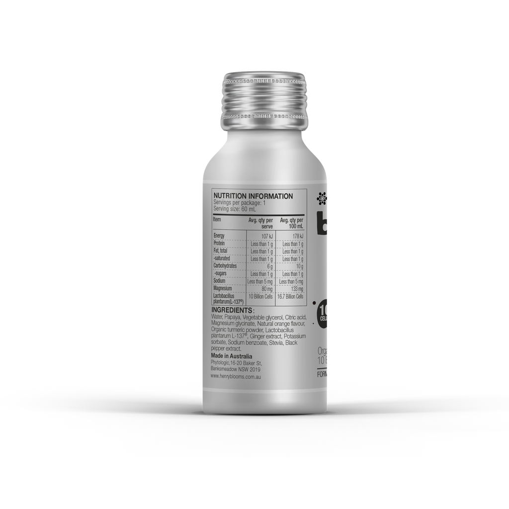 This turmeric probiotic drink contains 10 billion cells of Lactobacillus plantarum probiotic (L-137) per serving, enhancing nutrient absorption and promoting gut health to digest ‘Belly’ effectively. The blend includes organic turmeric, ginger, papaya, and magnesium, each chosen for their roles in reducing muscle soreness and supporting overall wellness. Henry Blooms supplement is crafted to provide a smooth, revitalizing experience that helps you recover faster and feel better daily.