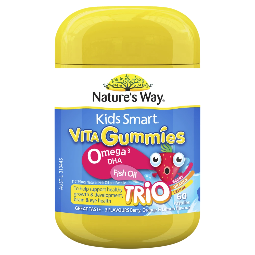 Nature's Way Kids Smart Vita Gummies Omega-3 DHA 60 Pastilles TRIO Natures Way offers a delicious and effective way to provide omega-3 dha gummies that support your child's brain and eye development. These gummies deliver essential omega-3 fatty acids, including DHA and EPA, which are crucial for children’s growing brains, nervous systems, and vision. Since the body cannot produce enough omega-3 on its own, these kids omega-3 supplements ensure your child receives the vital nutrients needed for healthy growth and cognitive function.