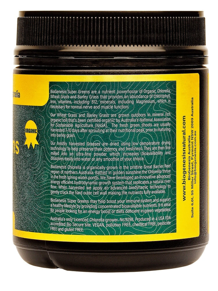 Experience the revitalizing power of BioGenesis Organic Super Greens Powder, a nourishing blend of Organic Chlorella, Wheat Grass, and Barley Grass that provides an abundance of chlorophyll, vitamins, minerals, and essential enzymes and antioxidants to support your overall health and well-being.
